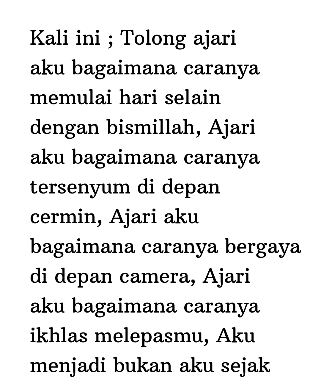 Moving on bukan artinya aku melupakan semua hal yang terjadi di antara kita. Ada banyak tokoh-tokoh cerdas Islam yang memiliki buah pikir istimewa diantaranya menelurkan banyak kata bijak untuk dijadikan renungan. Rinduku padamu masih menjadi debar Serupa denyut nadi yang tiada henti Berpacu tiap detik waktu Mengurainya dalam nada sendu.